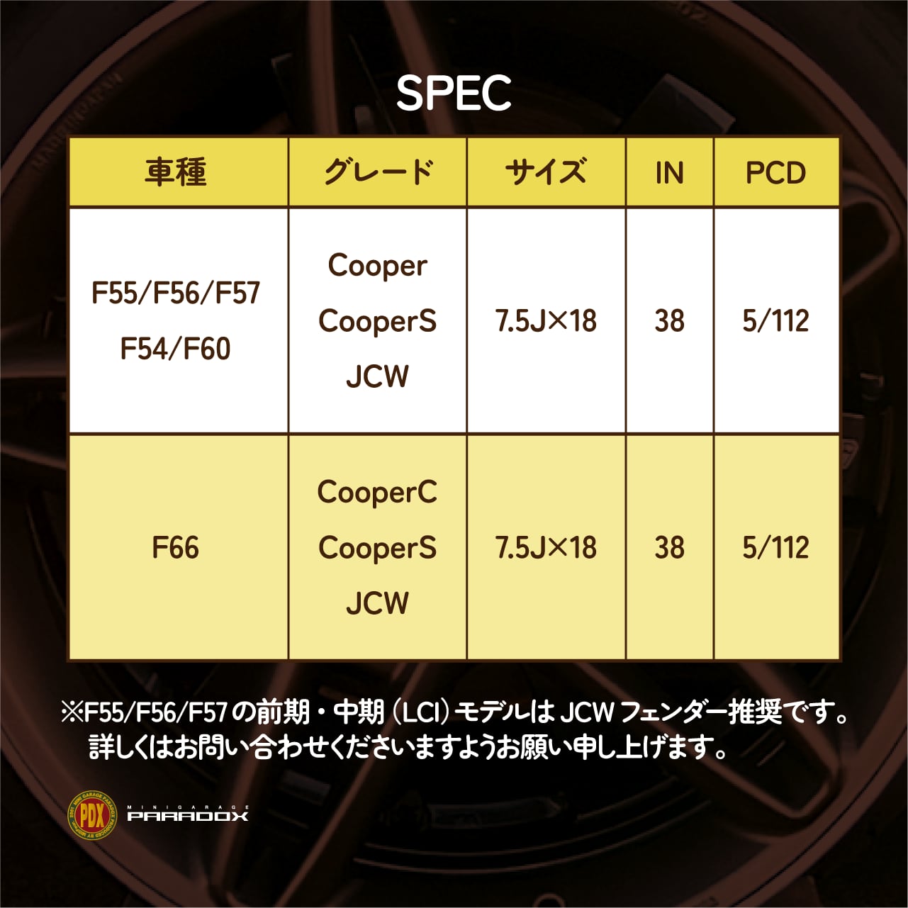 画像内SPECKよりご確認ください(F54・F60はスペーサーの装着を推奨します)